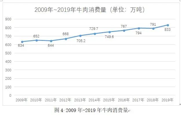 如(rú)圖所示,2009-2016年(nián),牛肉産量保持穩定,增幅不(bù)超過0.5%;2017年(nián)起,牛肉産量及增↔幅開(kāi)始提高(gāo),特别是(shì)2019年(nián)牛肉産量及增幅均創十年(nián)來(lái)新高(gāo)。但(dàn)2020年(nián)受疫情影(yǐng)響,牛肉産能(néng)又(yòu)有(yǒu)所下(xià)降。總體(tǐ)來(lái)看(kàn),牛肉産量增幅緩慢(màn)。 随著(zhe)經濟的(de)快(kuài)速發展,人(rén)民(mín)生(shēng)活水(shuǐ)平的(de)不(bù)斷提高(gāo),牛肉消費(fèi)€量逐年(nián)上(shàng)升,已保持8年(nián)正增速,且增速較快(kuài),消費(fèi)總量已達到(♦dào)全球第三,僅次于美(měi)國(guó)和(hé)巴西(xī)。從(cóng)2009年(nián)到(dào)2018年↔(nián),中國(guó)牛肉消費(fèi)量已由634萬噸增加至791萬噸,增長(cháng)幅度達到(dào)25%,2019年(nián)消費(fèi)量達到(dào)833萬噸§,創十年(nián)來(lái)新高(gāo)。農(nóng)業(yè)農(nóng)村(cūn)部預測,未來(lái)十年(nián)牛肉消費(fèi)量将保持增長(cháng)±,年(nián)均增長(cháng)率約為(wèi)2.7%(具體(tǐ)如(rú)圖4所示)。