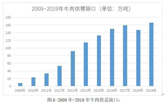 對(duì)比2009-2019年(nián)肉牛存欄量、出欄量、牛肉産量及消費(fèi)量走勢發現(xiàn),牛肉産量增速遠(yuǎn)遠(yuǎn)小(xiǎo)于消☆費(fèi)量增速,供需缺口逐年(nián)擴大(dà),2019年(nián)牛肉缺口達到(dào)166萬噸(具體(tǐ)如(rú)圖6所示)。