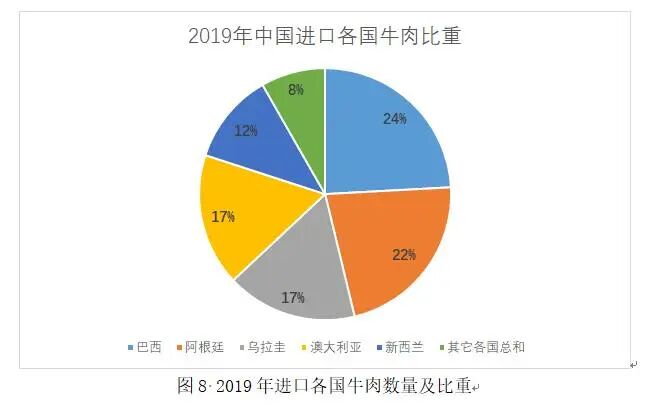 随著(zhe)供需缺口的(de)快(kuài)速擴大(dà),牛肉進口依賴度不(bù)斷增大(dà),進口量逐年(nián)增加,出口量保持₹在較低(dī)水(shuǐ)平且趨于平穩。2019年(nián)我國(guó)牛肉進口呈大(dà)幅增加的(de)态勢,進口量達166萬噸,同比增加了(le)59.6%;出口量為(wèi)0.2萬噸,同比減少(shǎo)約50%(具體(tǐ)如(rú)圖7所示)。淨進口量也(yě)有(yǒu)所擴大(dà),牛肉的(de)進口主要(yào)來(lái)自(zì)于巴西(xī)、阿根廷、澳大(dà)利亞、烏拉圭和(hé)新西(xī)蘭這¥(zhè)些(xiē)國(guó)家(jiā)(具體(tǐ)如(rú)圖8所示)。