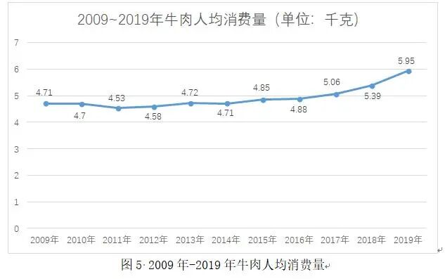 此外(wài),我國(guó)牛肉人(rén)均消費(fèi)量也(yě)逐漸上(shàng)升,從(cóng)2009年(ni án)的(de)4.71kg上(shàng)升到(dào)2019年(nián)的(de)5.95kg,增長(cháng)幅度達到(dào)26%(具體(tǐ)如(rú)圖5所示)φ。雖然我國(guó)牛肉人(rén)均消費(fèi)持續上(shàng)升,但(dàn)僅為(wèi)世界人(rén)均消費(fèi)量的(de)一(yī)半,與美(měi)國(guó)26kg的(↕de)牛肉人(rén)均消費(fèi)量差距更大(dà)。