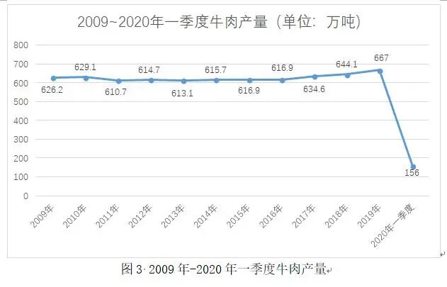 如(rú)圖可(kě)見(jiàn),2013年(nián)至2019年(nián),全國(guó)肉牛出欄量保持增長(chá←ng),特别是(shì)2019年(nián)出欄數(shù)量創十年(nián)來(lái)曆史新高(gāo)。2020受“新冠肺炎”疫情影φ(yǐng)響,多(duō)地(dì)活牛交易市(shì)場(chǎng)關閉,影(yǐng)響了(le)肉牛正常交易,出欄與補欄空(kōng™)檔期明(míng)顯加大(dà),導緻育肥牛出欄數(shù)量減少(shǎo)。 牛肉産量 2019年(nián),牛肉産量667萬噸,增加23萬噸,增長(cháng)3.6%;2020年(nián)一(yī)季度,牛肉産量156萬噸,減少(shǎ∏o)11萬噸,下(xià)降6.4%(具體(tǐ)如(rú)圖3所示)。