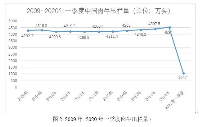 肉牛出欄量 2019年(nián),全國(guó)肉牛出欄4534萬頭,比上(shàng)年(nián)增加136萬頭,增長(cháng)3.1%。 2020年(nián)一(yī)季度,全國(guó)肉牛出欄1047萬頭,比上(shàng)年(nián)同期減少(shǎo)64萬頭,下(xià)降5.8%(具體(tǐ)如(rú)圖2所示)。